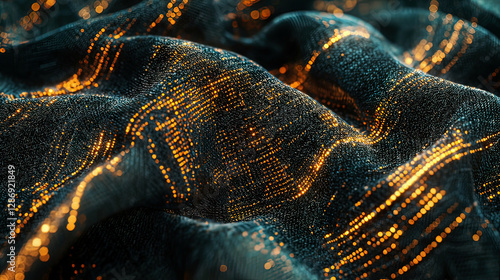 Close-up of smart fabric with biometric tracking, seamless texture, metallic fibers, subtle reflections, ultra-realistic