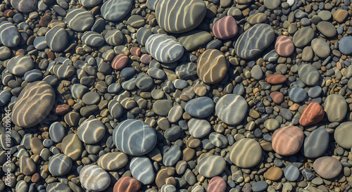 Close-up of smooth, multicolored pebbles submerged in clear water, with dappled sunlight casting striped patterns on their surfaces