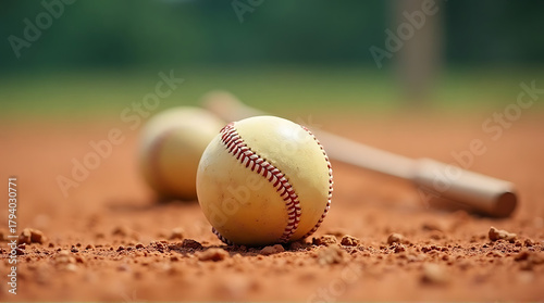 Close-up of softball and bat on the field showcasing sport equipment and focus on competition