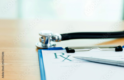 Closeup of stethoscope on rx prescription