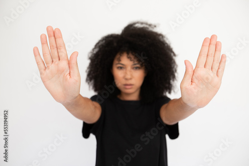 Close-up of stop signs made by serious young woman. Caucasian female model with afro hairstyle and brown eyes in casual clothes showing her palms as stop sign. Prohibition, advertising concept