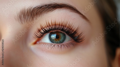 Close-up of striking blue eye with beautifully extended eyelashes showcasing a professional eyelash extension procedure with delicate reflections.