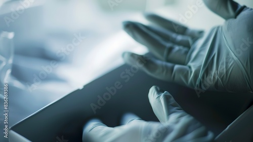 Close-up of surgical gloves in a box, in fog, deserted, soft focus, dawn light