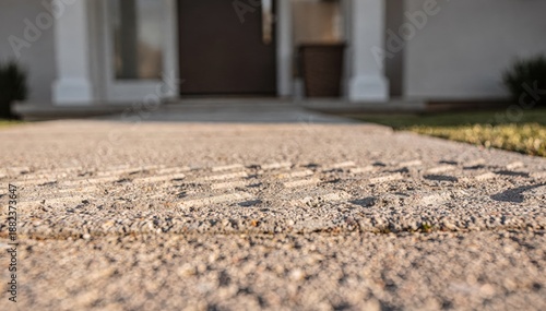 Closeup of tactile concrete path edges highlighting accessible routing towards a front door with blurred porch details.