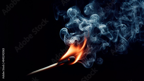 Close-up of the fire and smoke of a burning match against a black background to create a dramatic visual effect.