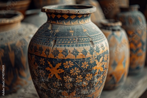 Close-up of the intricate patterns and textures on ancient pottery pieces, emphasizing their artistic and historical value