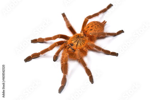 Closeup of the orange baboon tarantula Pterinochilus murinus (red colour form), a spider species from Southern and Eastern Africa photographed on white background.