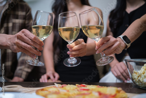 Close-up of three friends toasting with white wine glasses during a cozy night in.