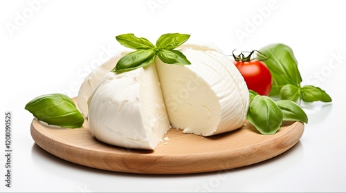 Closeup of Traditional Italian Buffalo Mozzarella Cheese. Mouth-watering Slice with Milk Dripping on White Background
