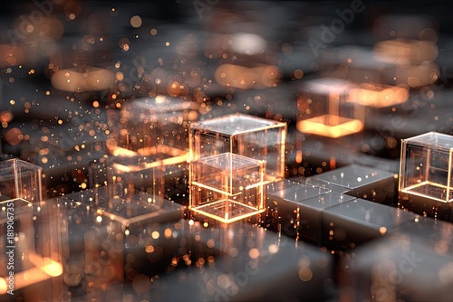 Close-up of transparent cubes with glowing edges scattered across a textured surface