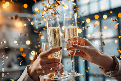 Close-up of two champagne glasses clinking together in a celebratory toast, with golden confetti in the background.