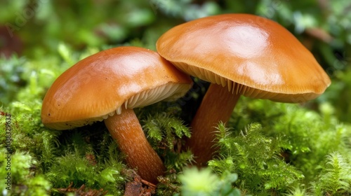 Close-up of two glossy brown mushrooms growing together amidst vibrant green moss with intricate textures and soft lighting.