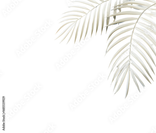Close-up of two off-white palm fronds against a black background. The fronds' intricate veining is visible, and tiny colored specks are scattered on the surface