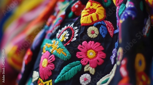 Close-up of vibrant floral embroidery on dark fabric. Intricate stitching and colorful thread create a beautiful textile art piece.