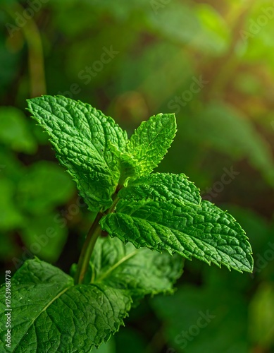 Close-up of vibrant, green mint leaves with sunlight glow