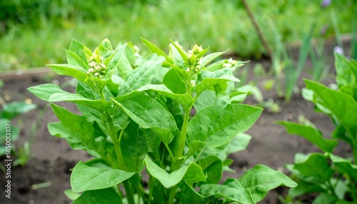 Close-up of vibrant green plant with small white flowers.