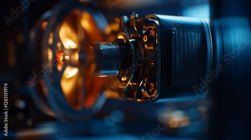 Close-up of Vintage Projector Mechanism: Glowing Lamp and Intricate Gears
