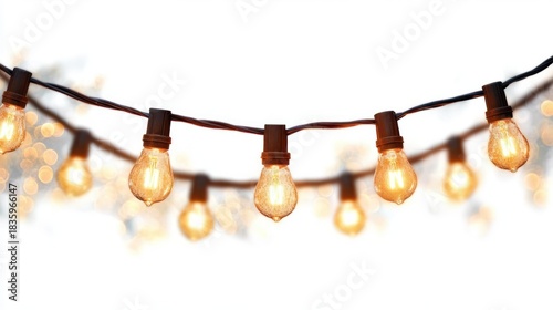 Close-up of warm glowing string lights with visible filaments creating a cozy and inviting atmosphere against a bright background
