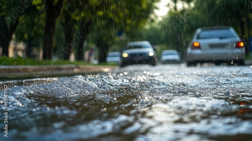 Close-up of water flowing from the street after heavy rain, trees and cars in the background