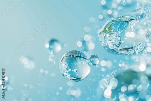 Close-up of water molecules with a light blue background, highlighting their spherical shape and transparency, digital art