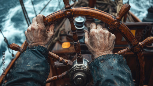 Close-Up of Weathered Hands Steering a Wooden Ship Wheel Amidst Rough Seas