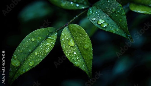 Close-up of wet leaves, glistening with water droplets. Dark background emphasizes vibrant green foliage