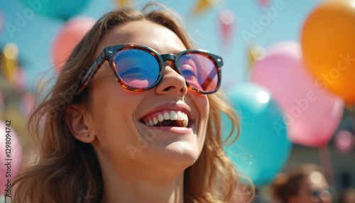 Close-up of woman with wide toothy smile wearing colorful sunglasses at festive event with balloons on sunny day. Joyful, cheerful mood, fun concept. Freedom, positivity, happiness.
