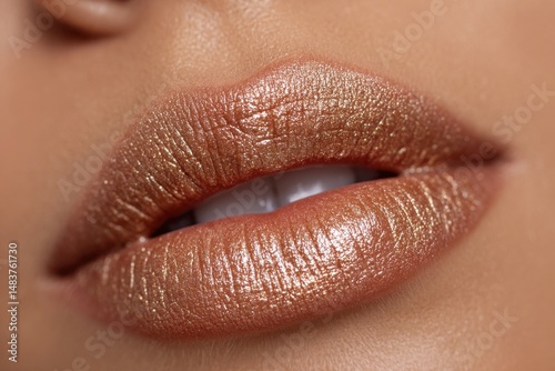 Close-up of woman's lips with shimmering golden bronze lipstick, creating a sensual and glamorous look with high-gloss finish and visible texture.