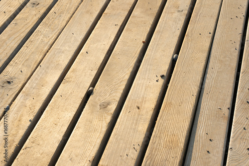Close-up of wooden deck with evenly spaced planks, small stones, natural light, rustic outdoor setting, relaxation, summer vibe, textured surface