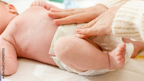 Closeup of young caring mother changing diaper of her newborn baby son lying on changing table at bedroom. Concept of babies and newborn hygiene and healthcare. Caring parents with little children.