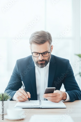 close-up of young entrepreneur writing business ideas in notebook while using smartphone for research