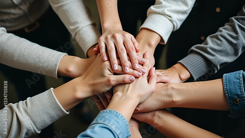 Close-Up of Young People Stacking Hands Together: A Powerful Symbol of Unity and Teamwork in Stock Photo with Empty Space for Your Creative Needs