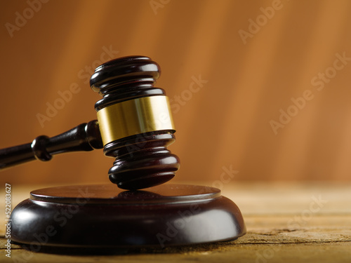 Close-up. On a beige background, a wooden gavel of a judge and an open book. Fair court, auction, courtroom, constitution, bible, rule of law. Minimalism.