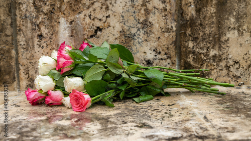 Close-up on a bouquet of roses, white and pink, on a paved outdoor floor, in rainy weather