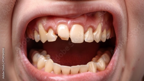 Closeup open mouth with very bad crooked teeth, caries. Ugly smile. Dental problems with oral hygiene.