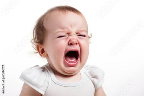 Closeup photo of a cute little baby girl child crying and screaming isolated on white background.
