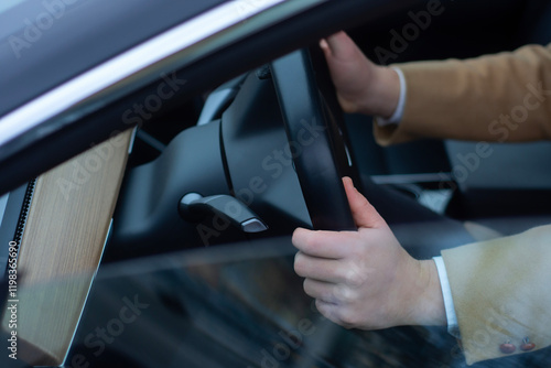 Close-up photo of a hand gripping a electric car's steering wheel.