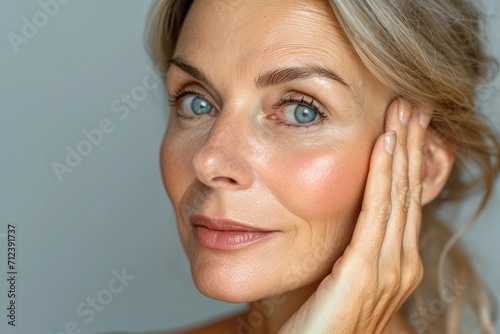 Close-up photo of adult woman touching her skin, she applies moisturizing cream balm. Cosmetology, plastic surgery, healthy lifestyle. Radiant skin. Advertising of cream, skin health products
