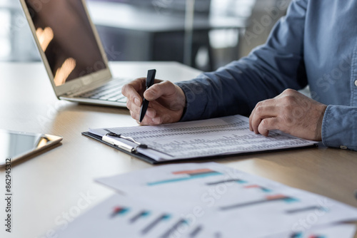 Close-up photo of the hands of a young businessman in a blue shirt sitting at a desk, holding a pen, working with data and documents, making notes and signing