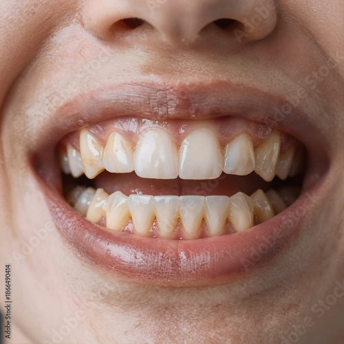 Close-up photo showcases yellow teeth and oral health concerns