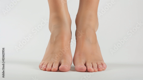 Close-up photo studio shot of the bare feet of several people on a white background.