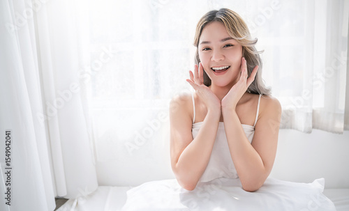 Closeup portrait beauty asian woman with fair perfect healthy glow skin hand touching cheek chin copy space, young beautiful asia gir,l pretty smile face Beauty korean asian women spa skincare banner