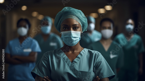 Close-up portrait of a african-american female nurse surrounded by colleagues.?reated with Generative AI technology.