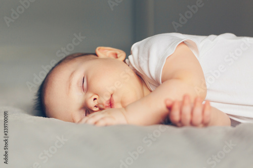 Close-up portrait of a beautiful sleeping baby boy on grey