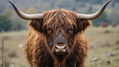 Close-Up Portrait of a Highland Cow with Brown Fur and Prominent Horns in a Rural Landscape