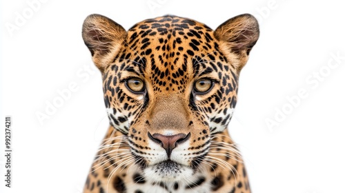 Close-Up Portrait of a Majestic Leopard on a White Background Showcasing Its Intense Gaze and Beautiful Fur Patterns