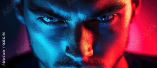 Close-up portrait of a man with intense gaze, illuminated by red and blue lights.