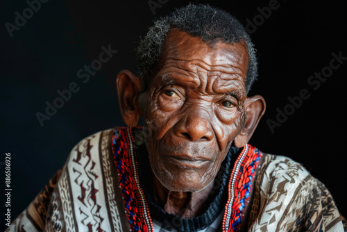 Close-up portrait of a senior man of African descent, studio photo, against a sleek gray studio backdrop