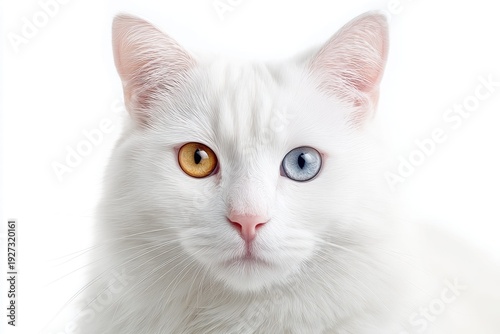 Close-up portrait of a white cat with heterochromia, showcasing its unique eyes