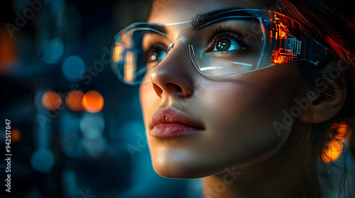 Close-up portrait of a woman wearing futuristic glasses looking upwards with a thoughtful expression.